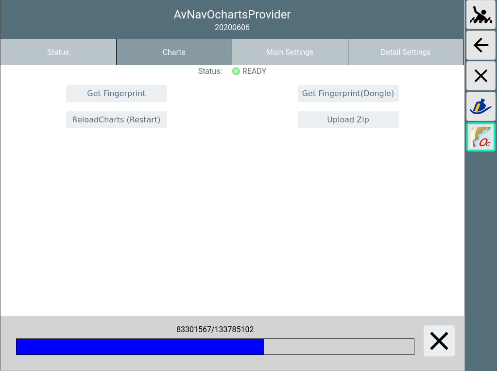 Falls der Status zu "ERROR" (rot) wird, wurde u.U. ein Zip-File hochgeladen, was für ein anderes System zugeordnet war. Details kann man im Log File (/home/pi/avnav/data/ocharts/provider.log) sehen.