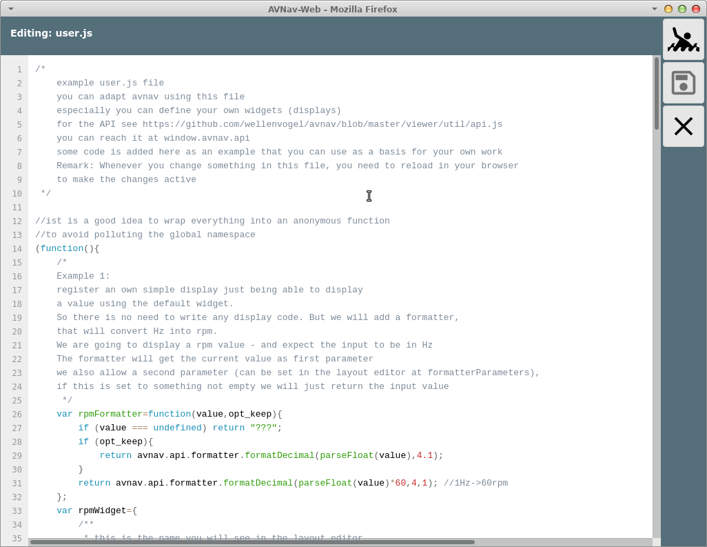 Um eine einfache Möglichkeit zu bieten, AvNav an seine Bedürfnisse anzupassen, kann man mit ein wenig Java Script Code AvNav relativ einfach erweitern.